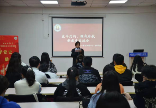 在一教408教室召开以“星斗灼灼,耀我启航”为主题的新老生交流会。2021级部分学生代表参加,其他学生通过腾讯会议平台观看。