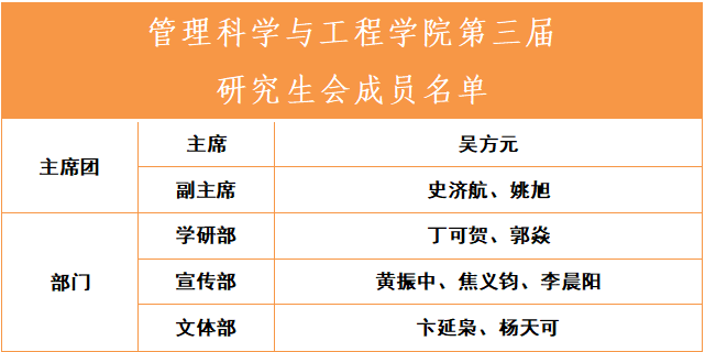 研究生会换届仪式圆满结束,现公布主席团成员及各部门成员名单:
