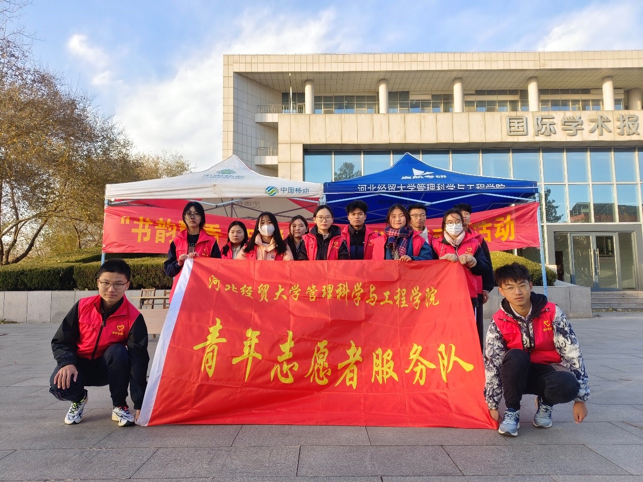 于图书馆前设置摊位,举办第三届“书韵飘香,品悦芳华”读书分享系列活动。