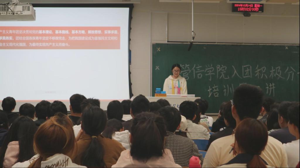 在培训过程中,周慧鋆向同学们讲解了《中国共产主义青年团章程》的相关内容,并且带领同学们学习了誓词和团旗团徽等基本知识。团课期间,同学们跟着主持人的思路积极回答问题,专心听讲,认真做笔记,参与互动,课堂氛围融洽。