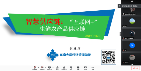 和科研处邀请,赵林度教授在腾讯会议平台做题目为“智慧供应链:‘互联网+’生鲜农产品供应链”学术讲座,讲座由祁红梅院长主持,学院全体教师、研究生以及智慧物流班本科生等共180余人聆听了此次讲座。