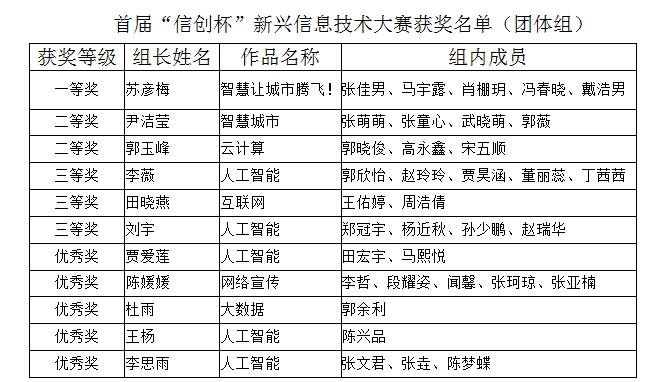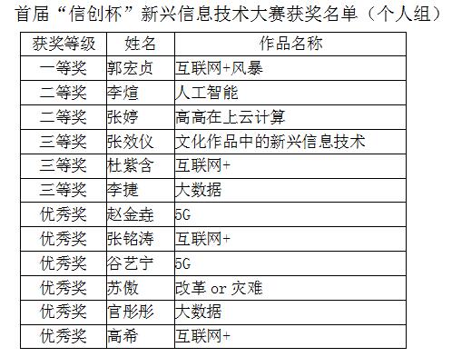 正在全球进行的新一轮信息技术革命,正以前所未有的方式对人类社会的发展产生重大影响。为更好地促进学生熟悉当前新兴信息技术的发展现状,给有创新意识和设计技能的学生提供一个展示平台。学院自2017年10月份开始以来,历时将近两个月的时间举办了首届“信创杯”新兴信息技术作品大赛,大赛涵盖物联网、云计算、大数据和人工智能等多个主题,得到学生的热烈欢迎,共收到参赛作品123份,其中个人组作品82份,团队组作品41份。经过微信投票、现场投票和评委打分后各评出个人组和团体组的获奖作品一等奖1项,二等奖2项,三等奖3项,优秀奖6项,其中获奖名单人如下。