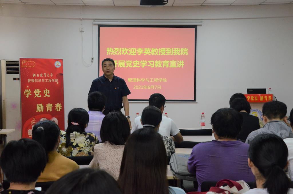 邀请马克思主义学院副院长李英教授在第一教学楼408教室开展“从党史学习教育中汲取历史智慧——树立正确历史观”党史学习教育宣讲活动。学院党委书记白玉祥、院长祁红梅、党委副书记田蓁子出席,学院全体教职工及部分学生党员、积极分子代表参加。