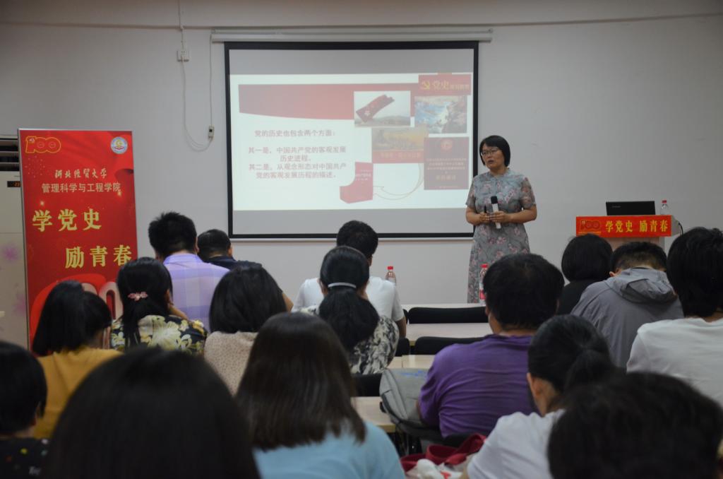 李英教授以习近平总书记在开展党史学习教育动员大会上的讲话为出发点,围绕“开展党史学习教育的重要意义”“正确认识历史并树立科学历史观”“坚持在唯物史观指导下学习党史”“如何树立正确历史观四个方面做出了深刻阐述”。她强调,开展党史学习教育是牢记初心使命、推进中华民族伟大复兴历史伟业的必然要求,深刻认识历史观是学习好党史的重要前提和基础。她通过古今中外有关历史观的示例引出马克思主义历史观——唯物史观,深入浅出地讲解了中国共产党历史的具体内涵,引导老师和同学们树立正确历史观。