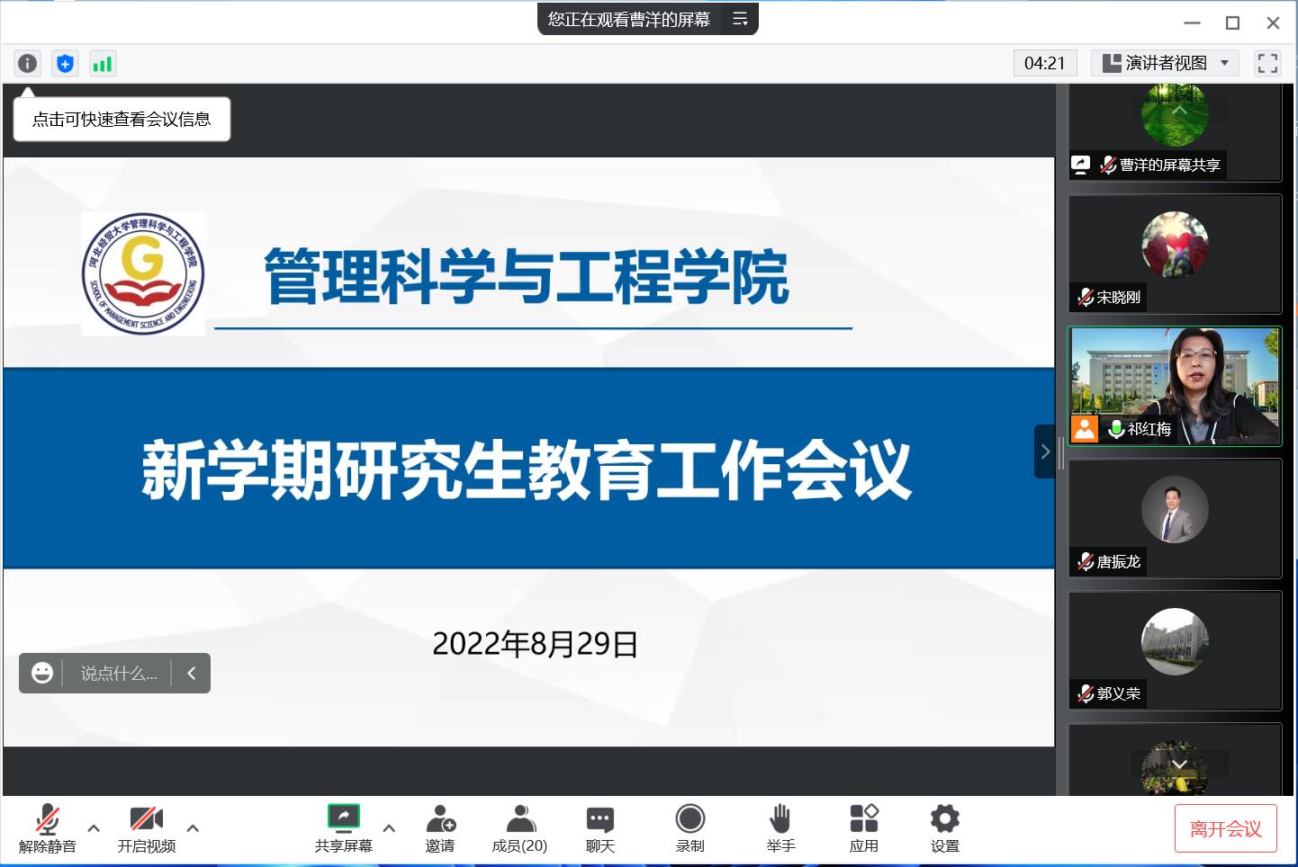 在腾讯会议线上召开新学期研究生教育工作会议。学院副院长王芹鹏、全体研究生导师、学科秘书20余人参加会议,会议由院长祁红梅主持。