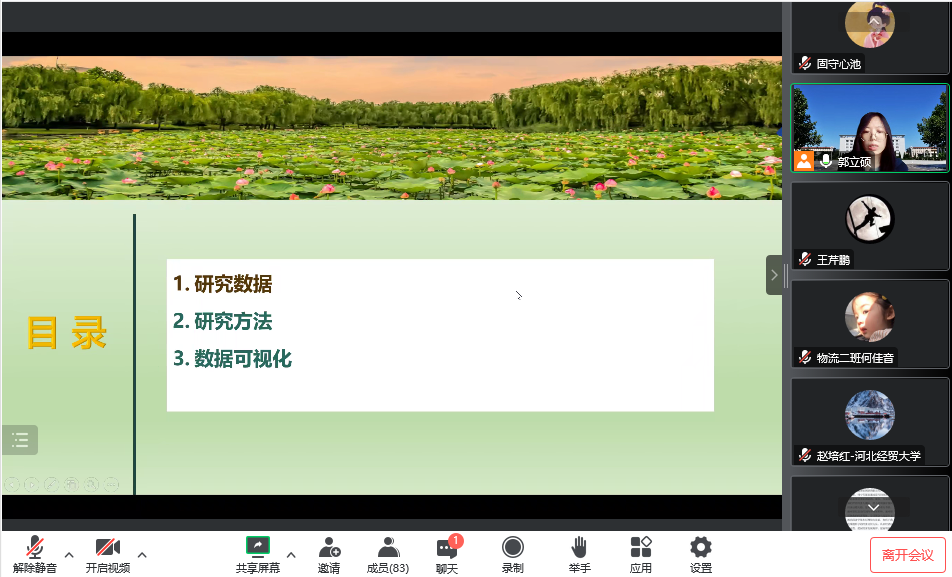 郭立硕博士通过腾讯会议做了题为“研究方法、数据可视化软件介绍及其应用”的学术讲座。讲座由学院副院长王芹鹏主持,学院教师、研究生、本科生90余人参加了此次讲座。
