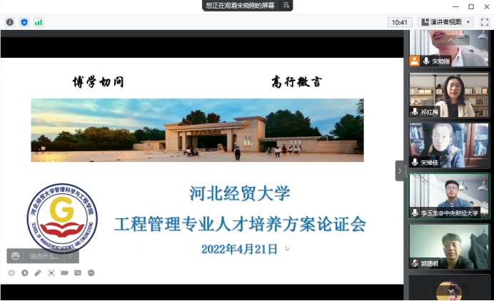 工程管理专业通过线上方式召开了人才培养方案修订专家论证会。会议特邀东北财经大学投资工程管理学院院长、工程管理专业教指委、评估委委员宋维佳教授,中央财经大学建设经济与管理系主任李玉龙教授,河北冀科工程项目管理公司总经理郭建明。会议由院长祁红梅主持,工程管理系全体教师参加。