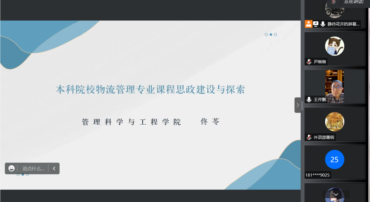 2022年11月17日,由教学评估与教师教学发展中心主办,管理科学与工程学院承办的本年度第78期教学沙龙活动顺利举行。物流管理系佟苓老师应邀做“本科院校物流管理专业课程思政建设与探索”交流分享。本次教学沙龙由学院副院长王芹鹏主持,学院全体教师参加了此次活动。