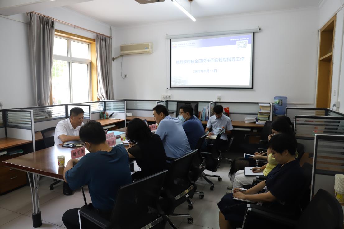 杨金田认真听取了学院党委书记白玉祥做的学院工作汇报,了解了学院在一流党建、学科发展、专业建设、学生工作等方面的情况。杨金田结合学校重点工作与学院发展实际,就学院发展定位、学科建设、科研建设、教师队伍建设、专业建设等工作提出了意见和建议。