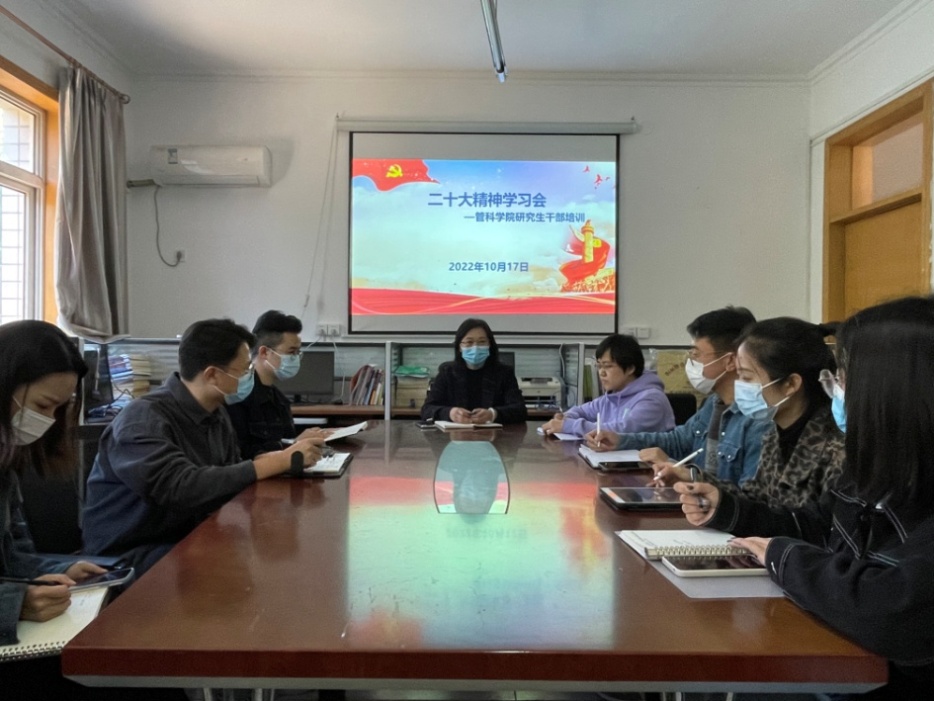 党的二十大开幕后的第一个工作日,10月17日,学院召开研究生干部培训-暨二十大精神学习会,祁红梅带领研究生学生干部学习习近平总书记报告,并深入理解把握重点词句,表示将以习近平总书记的报告为指引,全力推进学院研究生的培养教育工作发展。曹洋和参会的研究生学生干部分享了学习二十大精神的心得体会。参会师生深感肩头责任重大,使命光荣。在今后,将进一步学习贯彻习近平总书记的重要讲话精神,把全部精力和真情投入到学院研究生工作和学习中。