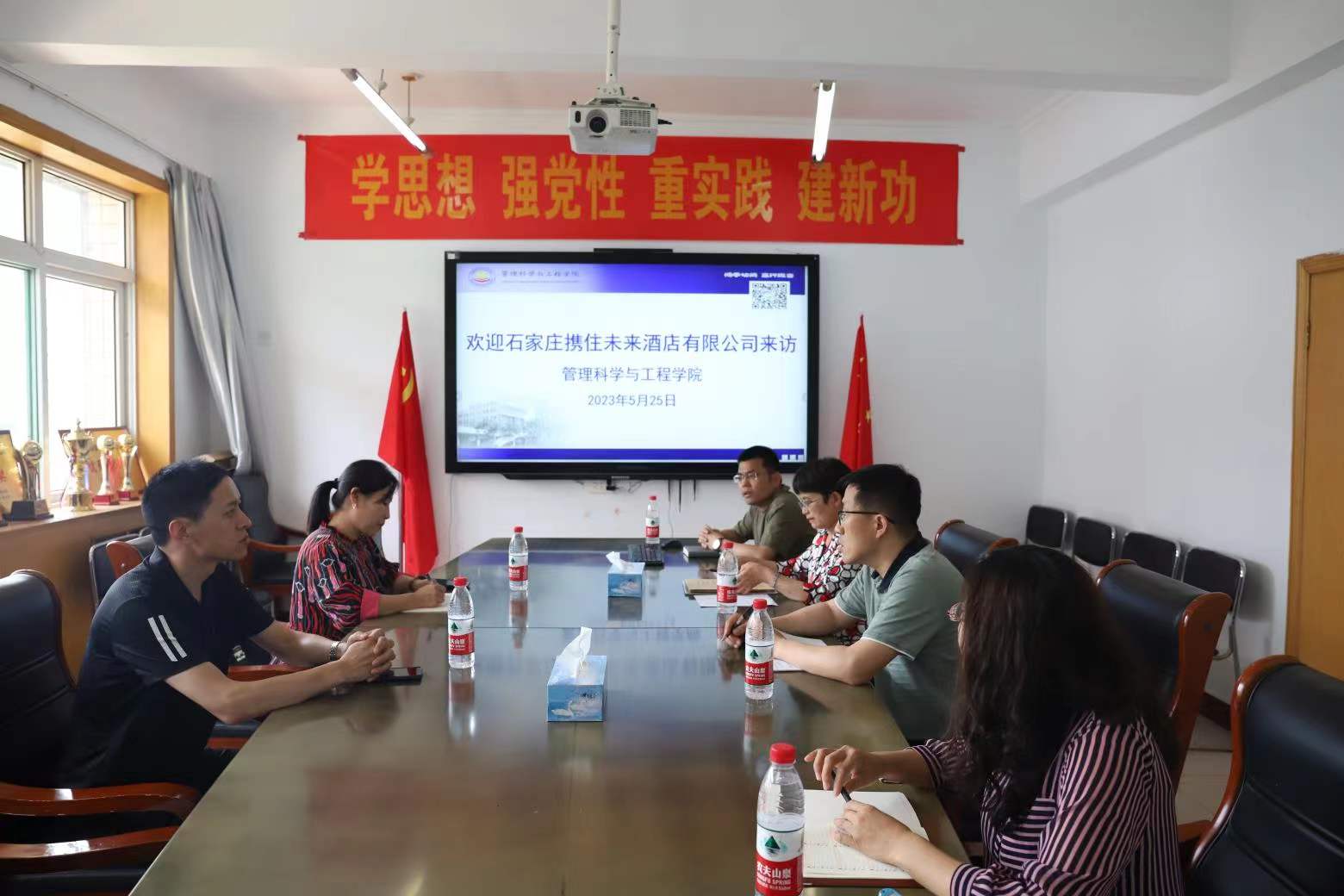 在三办会议室与石家庄携住未来酒店有限公司进行了校企合作专项交流,副院长王芹鹏、大数据管理与应用系教师张雪峰、李焱和马秀红参加。