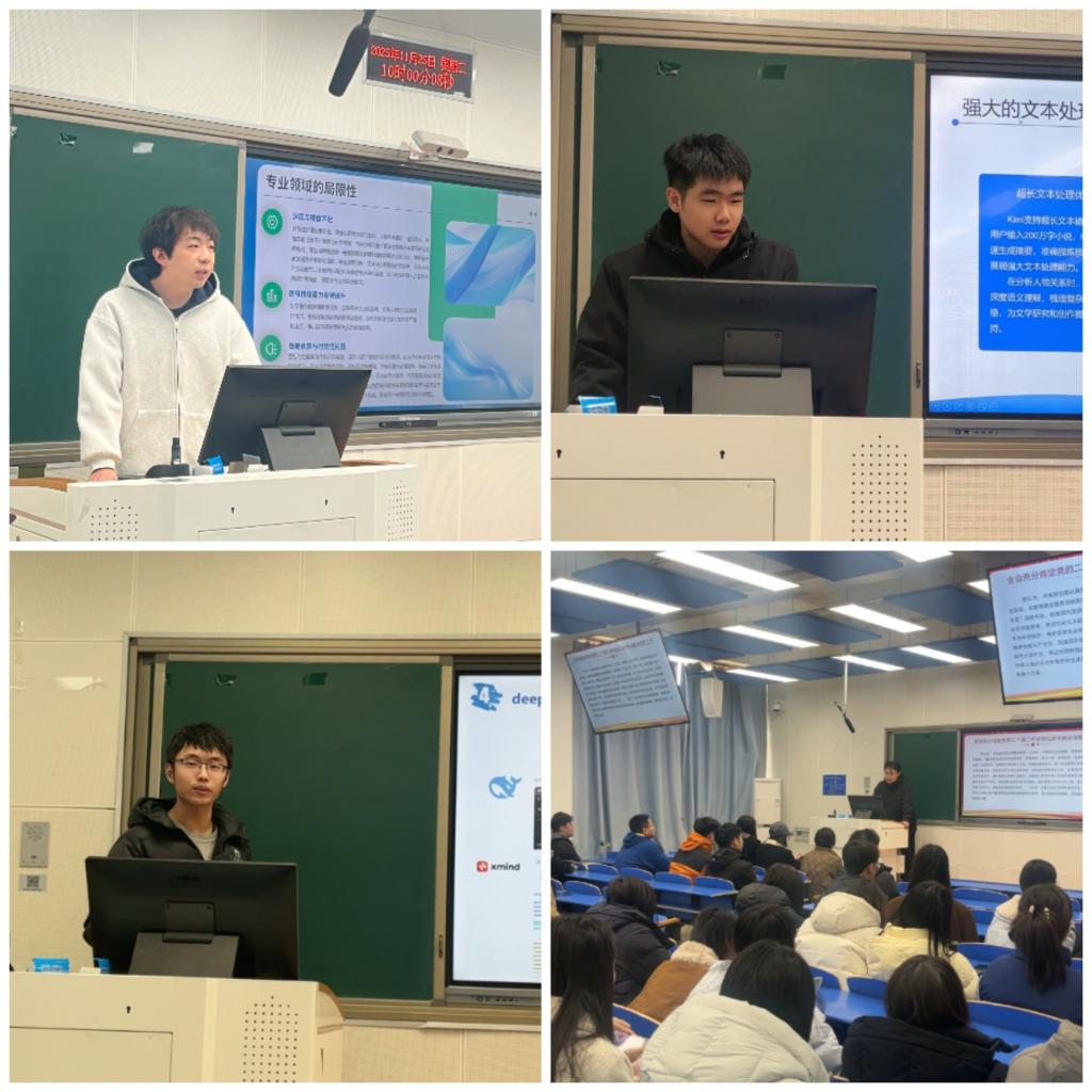 杨天爽围绕“豆包”展开,从底层技术架构、交互功能亮点等维度进行详细讲解,清晰呈现了其技术特性;马若飞聚焦“Kimi”模型,系统梳理其技术迭代脉络,深入剖析该模型在长文本处理、多语言交互等场景下的核心优势;姚张明则以“DeepSeek”为核心,重点阐释其在专业领域问答、科研数据处理等方面的独特价值。他们还结合自身实操经验,为同学们分享了高效运用大模型的实用技巧。