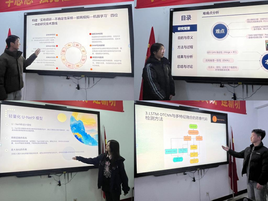 决赛以答辩形式进行,参赛同学聚焦热红外图像彩色化、碳排放因素识别、恶意代码检测、医学影像分割等多个研究主题,结合研究背景、核心方法与创新点进行详细讲解,呈现了兼具创新性与实用性的学术成果。评委老师针对论文逻辑、技术细节等方面进行提问,现场互动氛围热烈。
