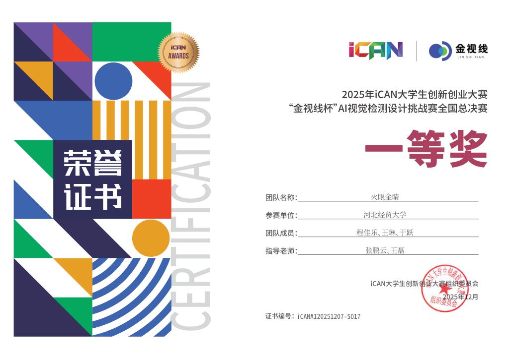 作为全国普通高校大学生的重要赛事,iCAN大赛自2007年创办以来,始终以培养创新思维、提升实践能力为核心,本次AI视觉检测设计挑战赛采用虚拟仿真与实际案例相结合的竞赛模式,全面考察参赛者的跨学科融合与技术应用能力。总决赛中,程佳乐团队的参赛项目立足工业质检痛点,融合机器学习与计算机视觉技术,构建了高精度、高效率的智能检测系统,在识别准确率与检测响应速度上表现突出,其创新设计思路与工程应用价值获得评委的好评,最终斩获一等奖。要雨涵团队则聚焦实际应用场景,凭借稳定的性能表现荣获三等奖。