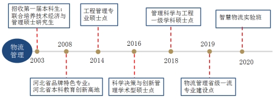 物流管理专业成立于2002年,为河北省一流建设专业、省级特色专业、河北省本科教育创新高地,是国内最早开办物流管理专业的院校之一。2003年联合培养技术经济与管理硕士研究生,2014年设立工程管理专业硕士点,2016年设立科学决策与创新管理学术型硕士点,2018年设立管理科学与工程一级学科硕士点。2020年本科专业整体升级为“新财经智慧物流”实验班。