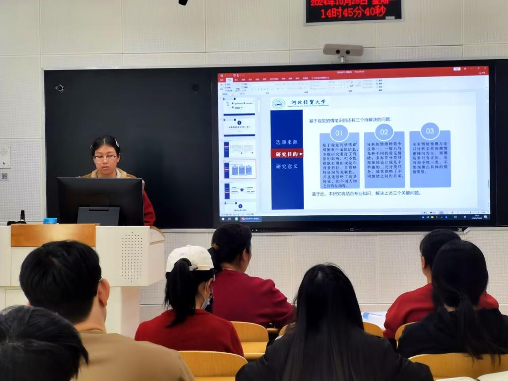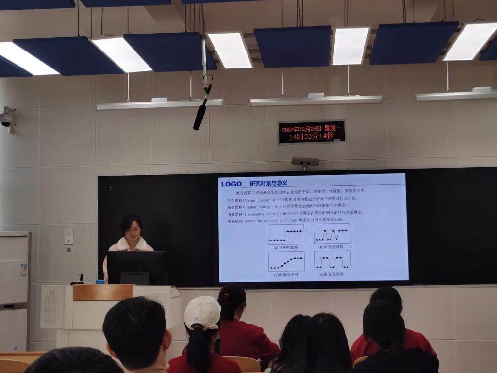 在三教B110教室开展管信研究生学术沙龙第二期活动。本期活动由2022级研究生冯月华和李雯秀分别围绕“融合前景和背景特征的多标签视觉情绪识别与预测研究”和“基于流数据挖掘的概念漂移自适应方法研究”两个主题进行学术分享,李晓娟老师主持,导师忽丽莎及部分老师、研究生参加。