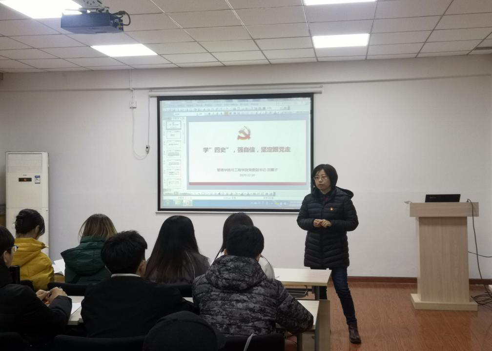 在一教408教师组织开展“四史”学习教育专题党课。此次党课由学院党委副书记田蓁子主讲,学院全体入党积极分子参加。