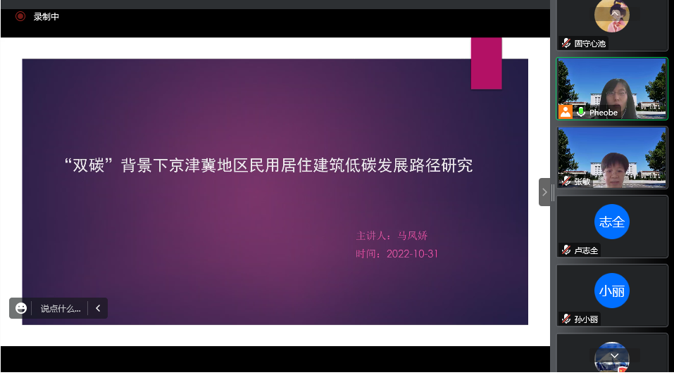 马凤娇就自己的研究方向,介绍了“双碳”背景下建筑领域碳排放的最新研究进展,提出了从“提质”和“控量”两个方面控制建筑领域碳排放的直接路径。在研究项目中尝试将建筑能耗模拟软件应用到区域建筑碳排放领域,从而更科学的提出建筑能耗的管理路径。会后,与会师生重点探讨了如何用不同的方法评估建筑能耗,以更好的实现建筑领域碳管理的目标。
