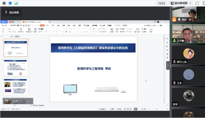 承办的本年度第16期教学沙龙活动顺利举行。大数据管理系李焱老师应邀做“案例教学在《大数据管理概论》课程思政建设中的应用”交流分享。近100名院内外教师参加,活动由教学副院长王芹鹏主持。