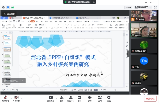 经济研究所副所长李建英教授在腾讯会议做了题为“河北省‘PPP+自组织’模式融入乡村振兴案例研究”的学术讲座。讲座由院长祁红梅主持,副院长王芹鹏、工程管理系全体教师及2021级工程管理专业研究生共30余人参加。