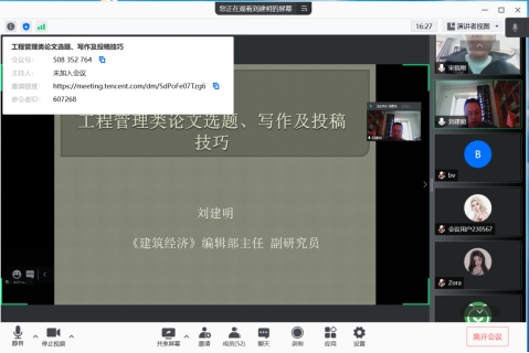 和科研处邀请,《建筑经济》杂志社编辑部主任刘建明副研究员在腾讯会议平台作题为“工程管理类论文选题、写作及投稿技巧”的学术讲座,讲座由工程管理系主任宋晓刚主持,学院部分教师、研究生及本科生共50余人在线聆听了此次讲座。