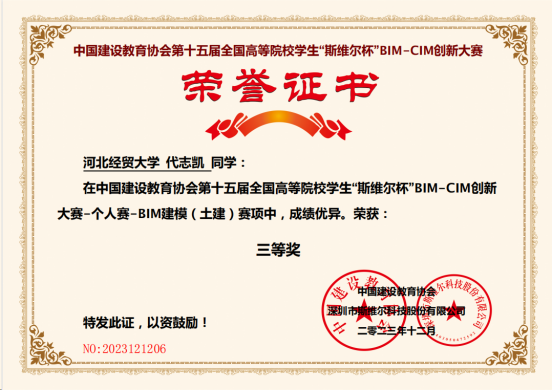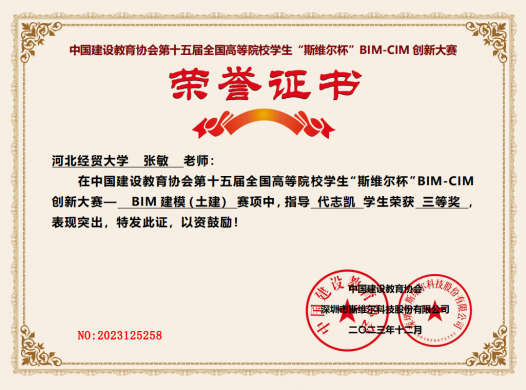 近日,第十五届全国高等院校学生“斯维尔杯”BIM-CIM创新大赛BIM建模个人赛获奖名单公示,工程管理系张敏老师指导学生参加了BIM建模项目比赛,获全国三等奖1项。