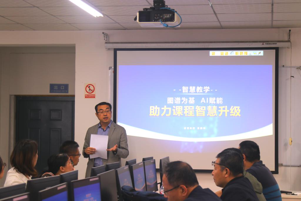 培训会上曹老师通过基于知识图谱对智慧课程升级的案例分析,阐述了什么是智慧课程以及智慧课程的构建流程,重点对AI助教和AI工作台功能和操作实践进行了演示,教师们对平台辅助生成教案、批改作业、考试出题、学情分析等功能产生了浓厚的兴趣。会后展开了热烈的互动交流,为今后AI智慧课程建设打下良好的基础。