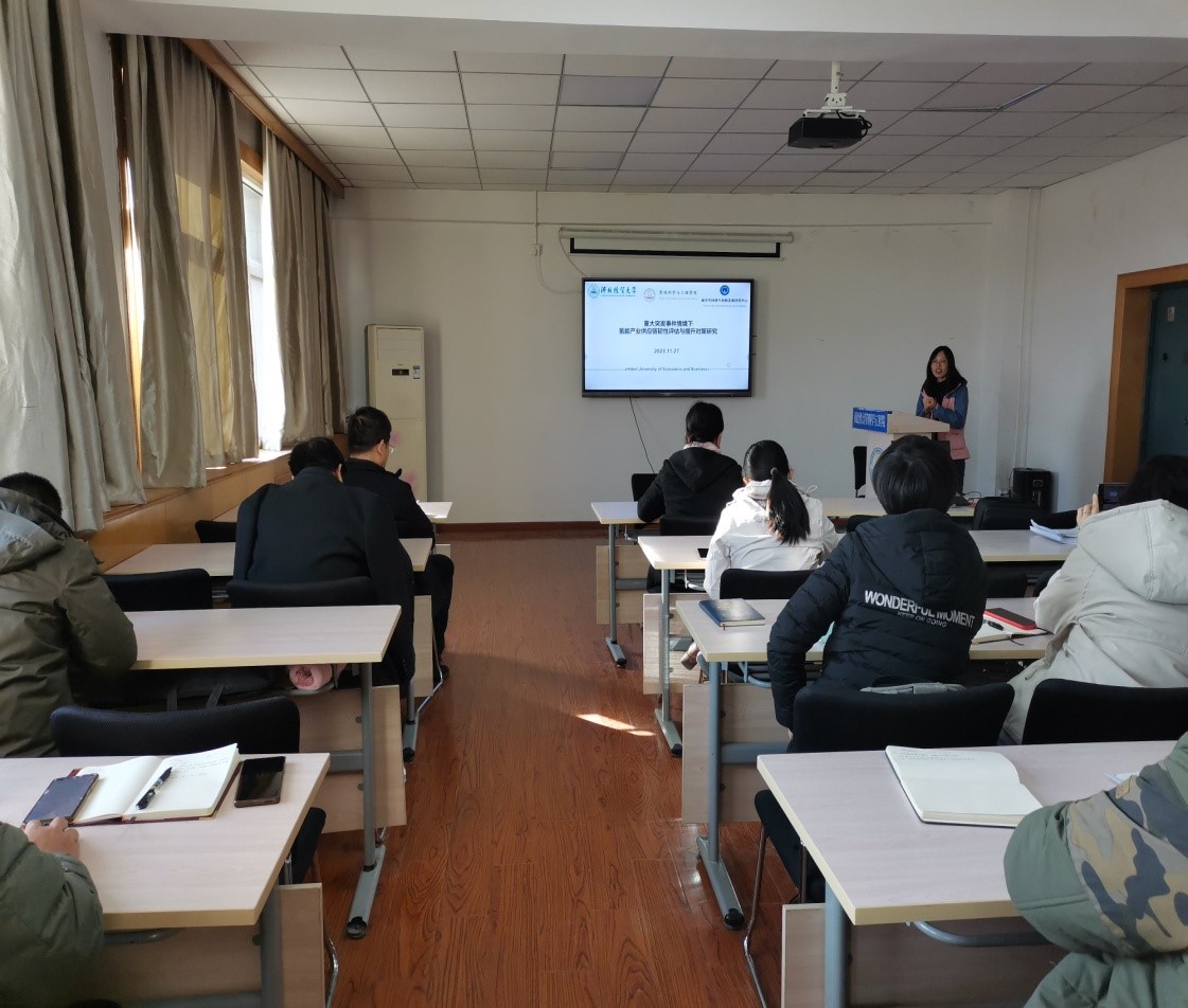 郭立硕博士结合参与撰写的国家级重大基金项目,作了题为“重大突发事件情境下氢能产业供应链韧性评估与提升对策研究”的学术讲座,学院教师及研究生参加。